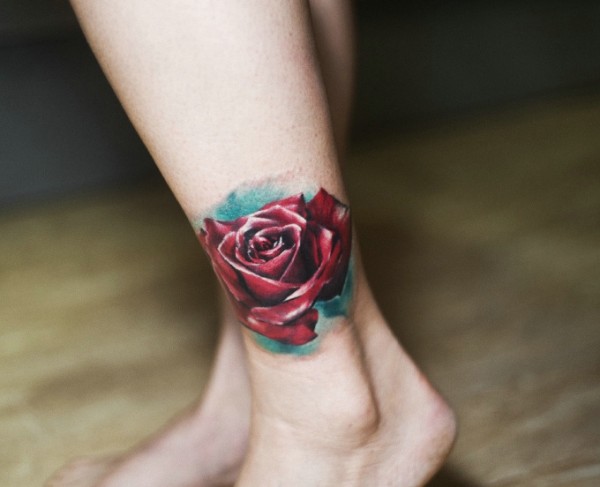 落在腿部的一朵红玫瑰纹身图片