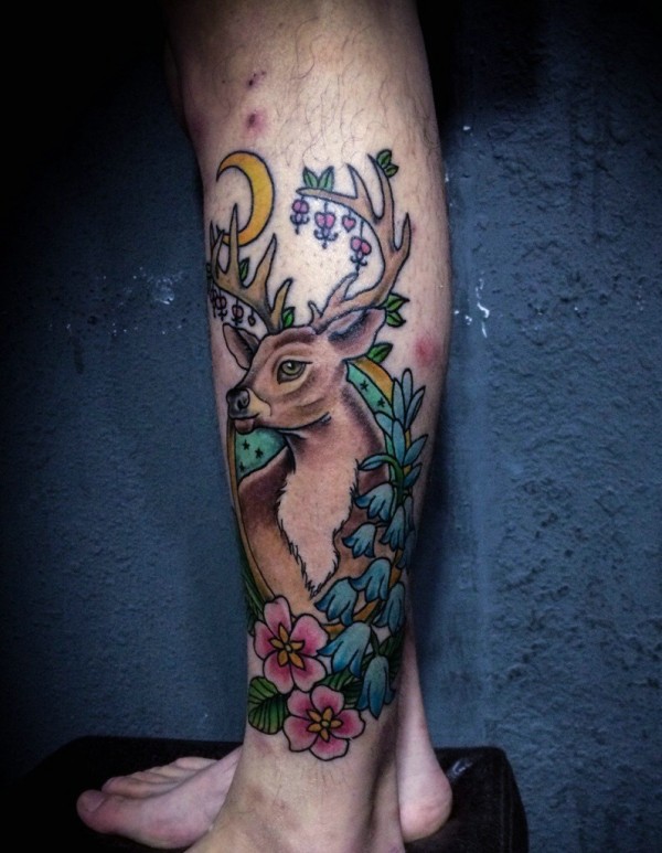 遮盖腿部的彩色梅花鹿纹身刺青