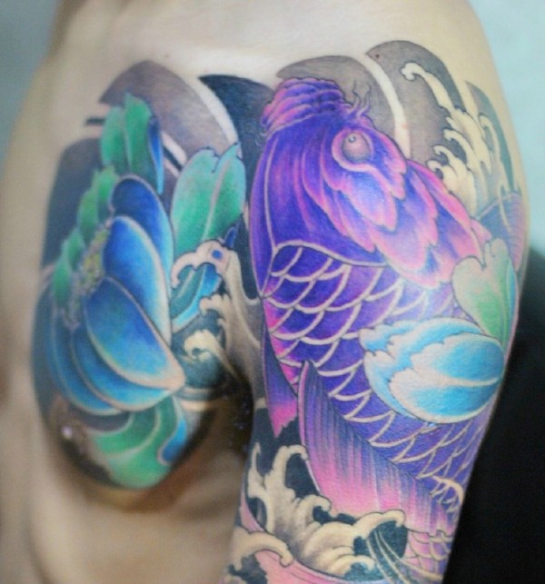 抢眼的半甲紫色鲤鱼纹身刺青