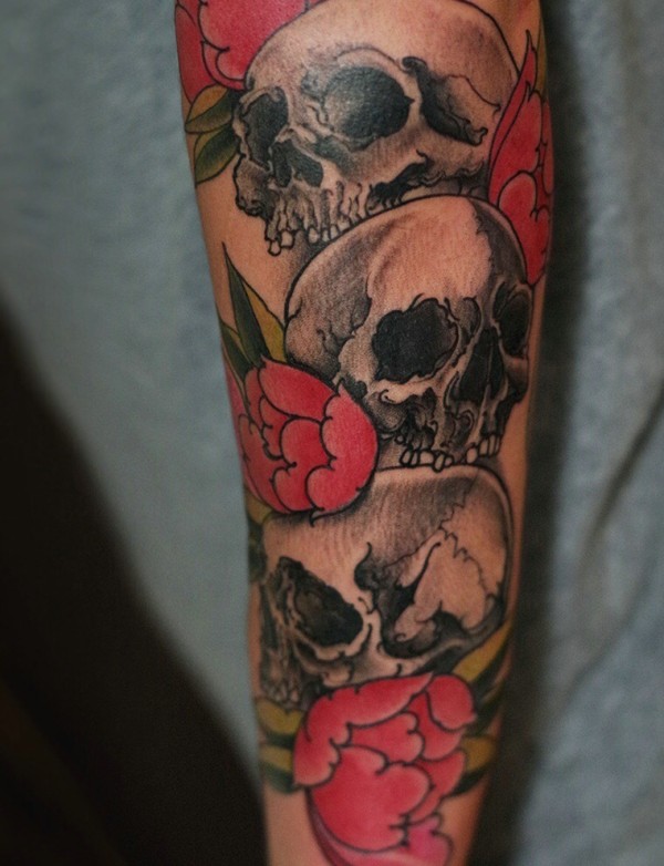 花朵配骷髅的个性花臂纹身刺青