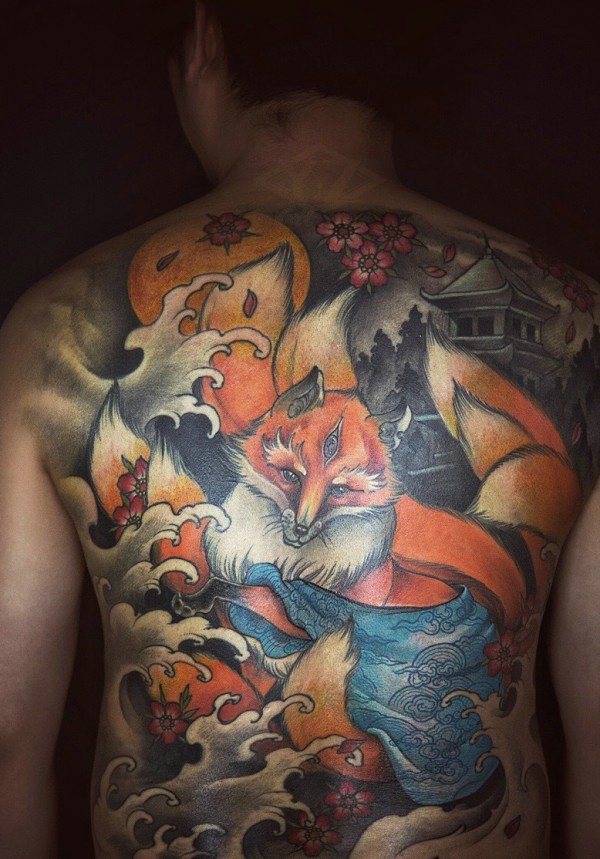 个性男士满背彩色狐狸纹身图案