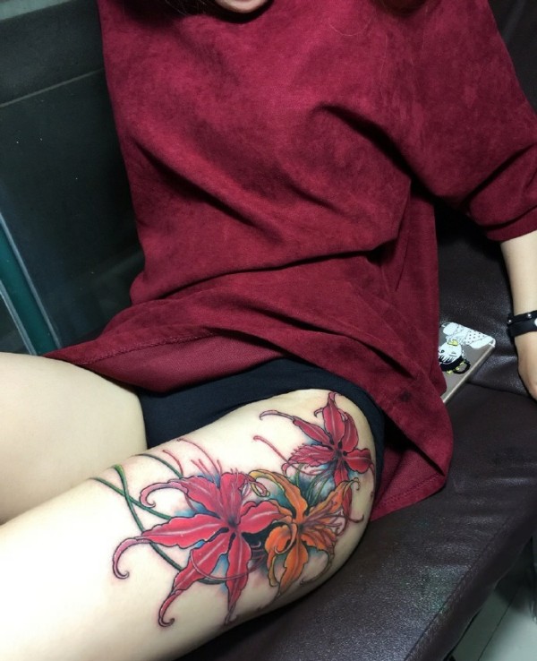 大腿外侧鲜艳无比的彼岸花纹身刺青