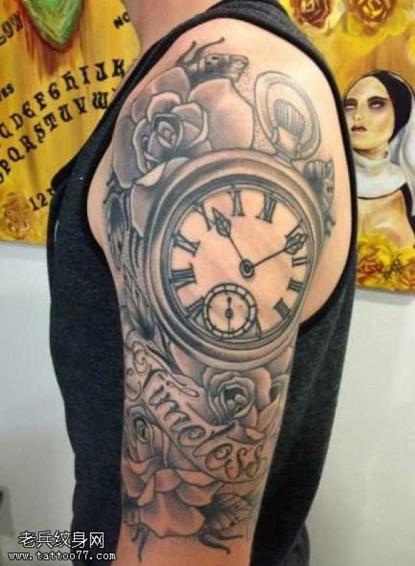 胳膊黑灰时钟纹身图案