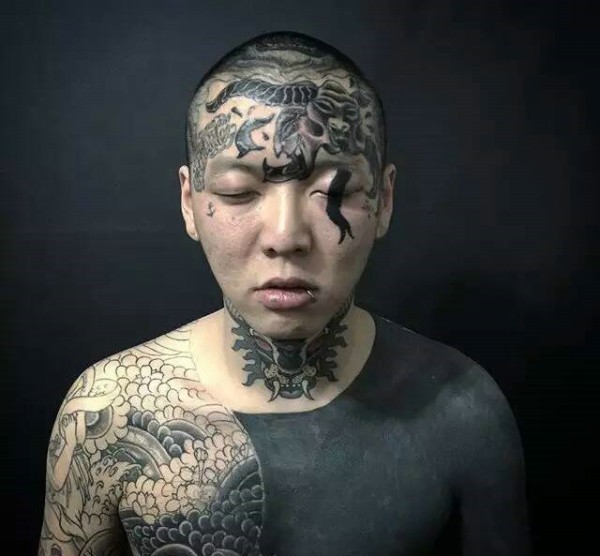 个性男士满身和头部的另类纹身图片