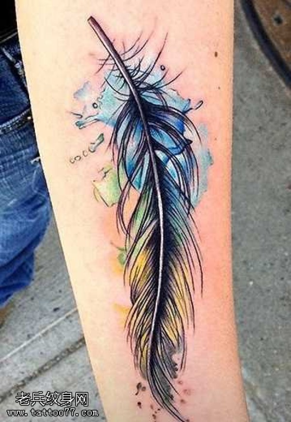 手臂彩蓝羽毛纹身图案