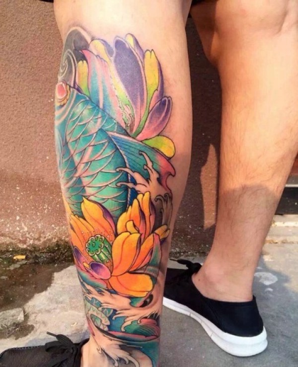 传统鲤鱼花小腿纹身_腿部纹身图案大全_纹身图吧