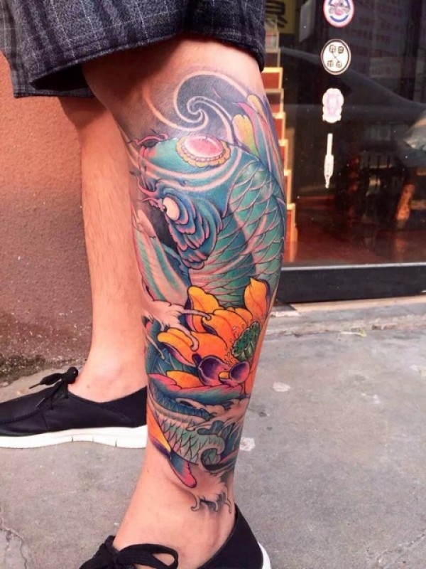 传统鲤鱼花小腿纹身_腿部纹身图案大全_纹身图吧
