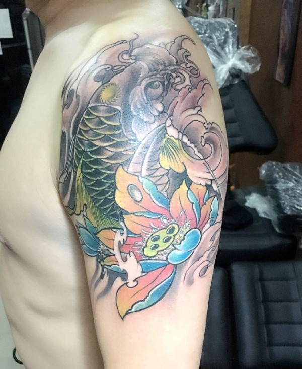 大臂彩色鲤鱼纹身图案青春无敌