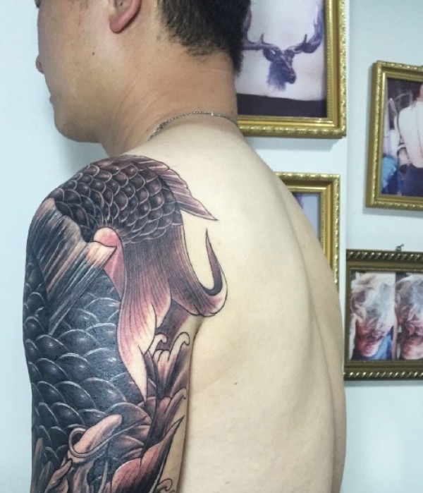 成熟男士大臂活力黑白鲤鱼纹身图案