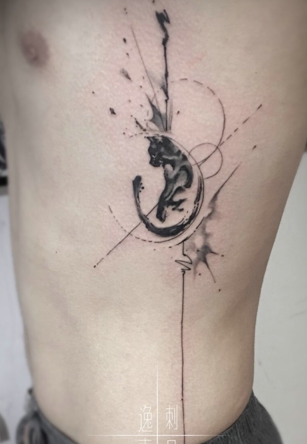 女生后腰纹身黑白灰风格抽象线条纹身图案