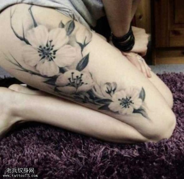 腿部黑白独特梅花纹身图案