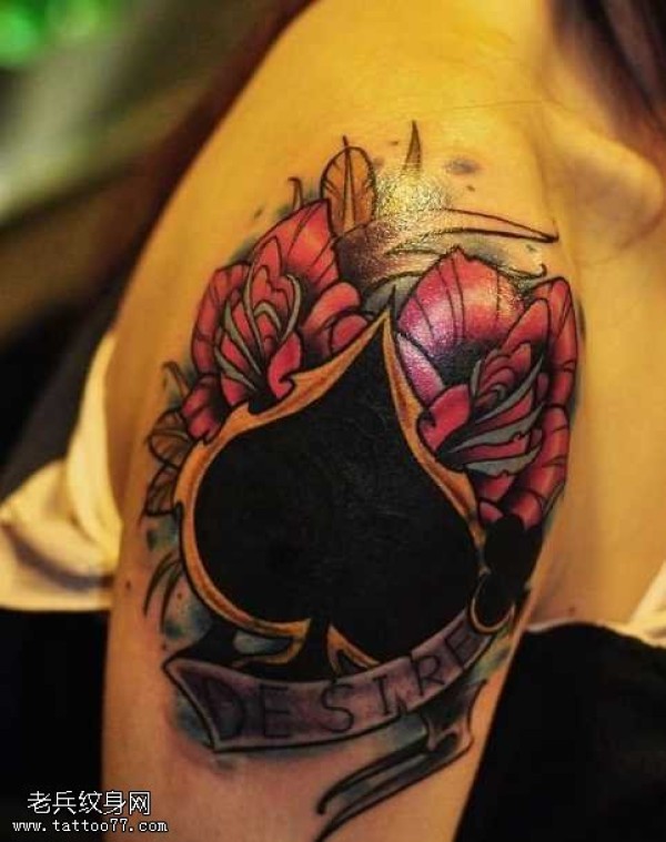 胳膊黑桃心玫瑰花纹身图案