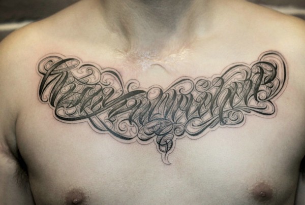 男士胸前精致的花体英文纹身图片