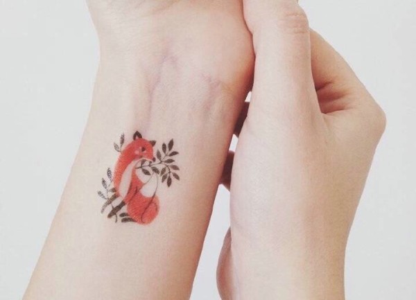 手腕小狐狸叼树叶纹身图片很可爱