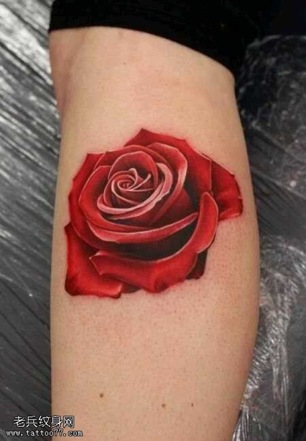 腿部一朵鲜红的玫瑰纹身图案