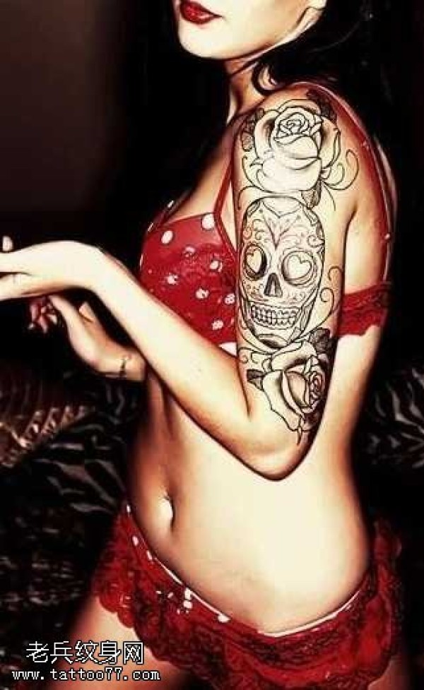 女生手臂经典潮流的骷髅与玫瑰花纹身图案
