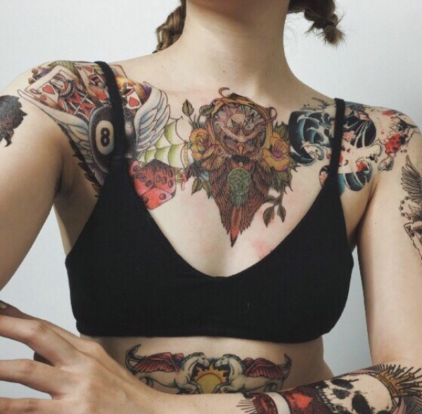 让人震撼的女士胸前猫头鹰纹身刺青