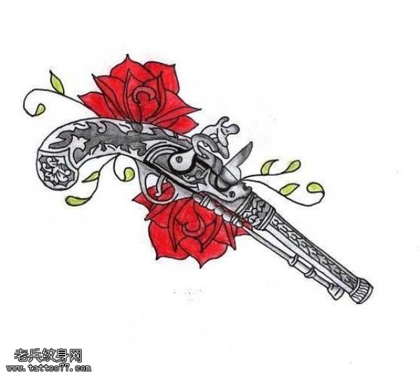 手稿手枪玫瑰纹身图案