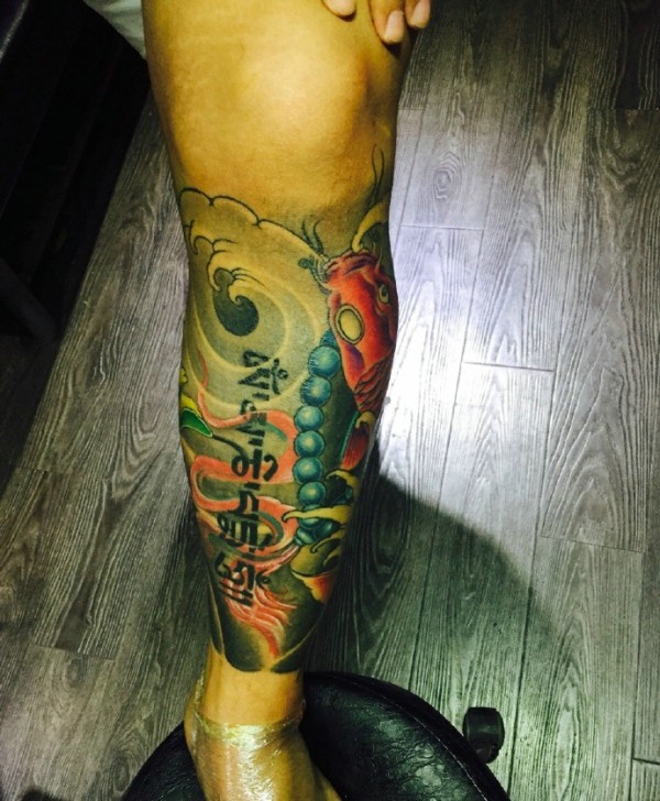 梵文与红鲤鱼结合的腿部纹身图案