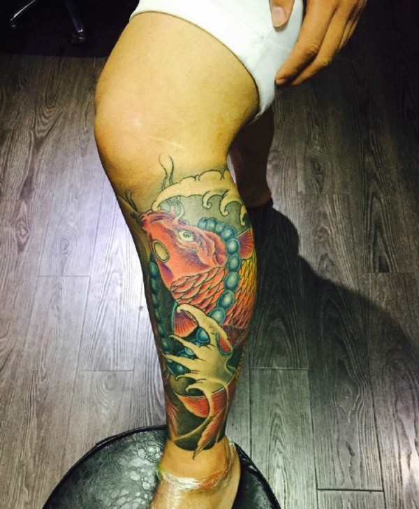 传统鲤鱼花小腿纹身_腿部纹身图案大全_纹身图吧