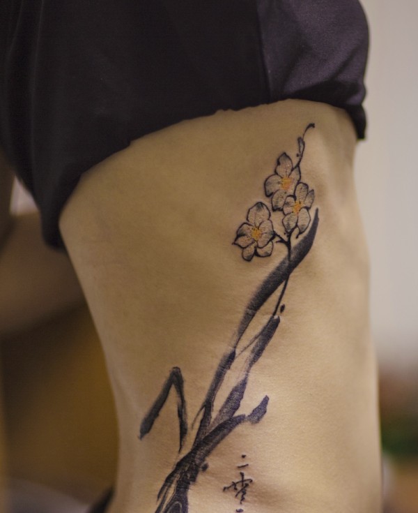 处在侧腰部的水墨花朵纹身图案
