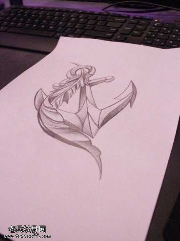 手稿船锚羽毛纹身图案