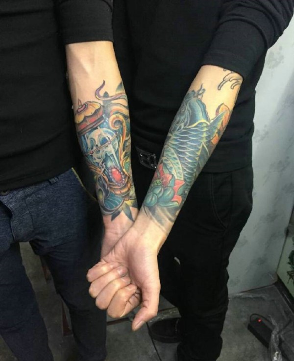 拼接而成的手臂彩色纹身刺青