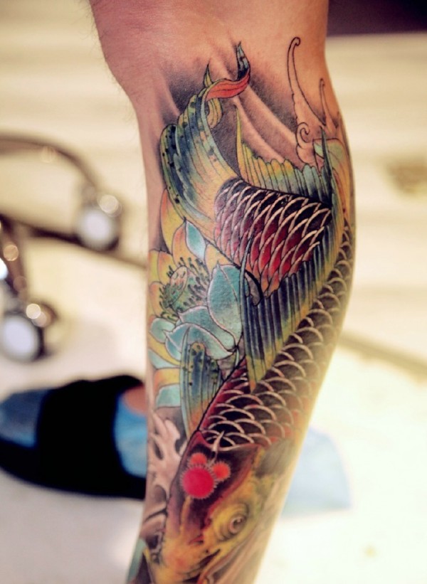 包小腿闪闪发亮的红鲤鱼纹身刺青