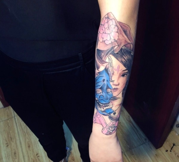 花妓与般若结合的花臂纹身图案