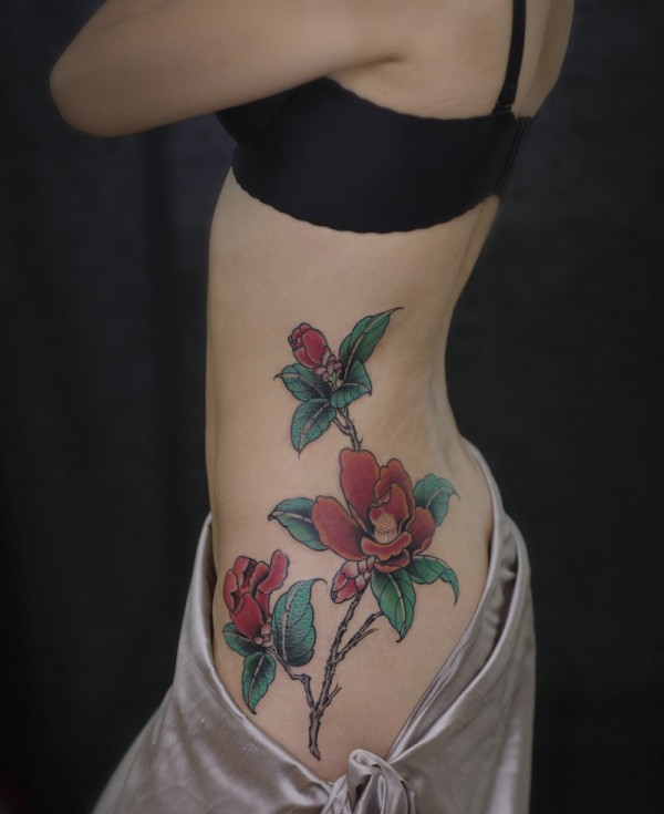 女生玲珑腰部的依兰花图案纹身女生腰部嫣红底_腰部纹身图案大全_纹身图吧