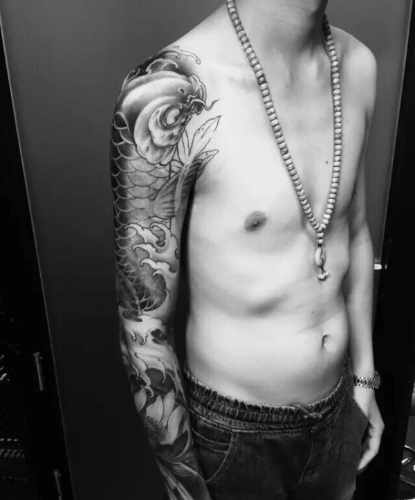 包手臂黑白鲤鱼纹身刺青年轻有活力