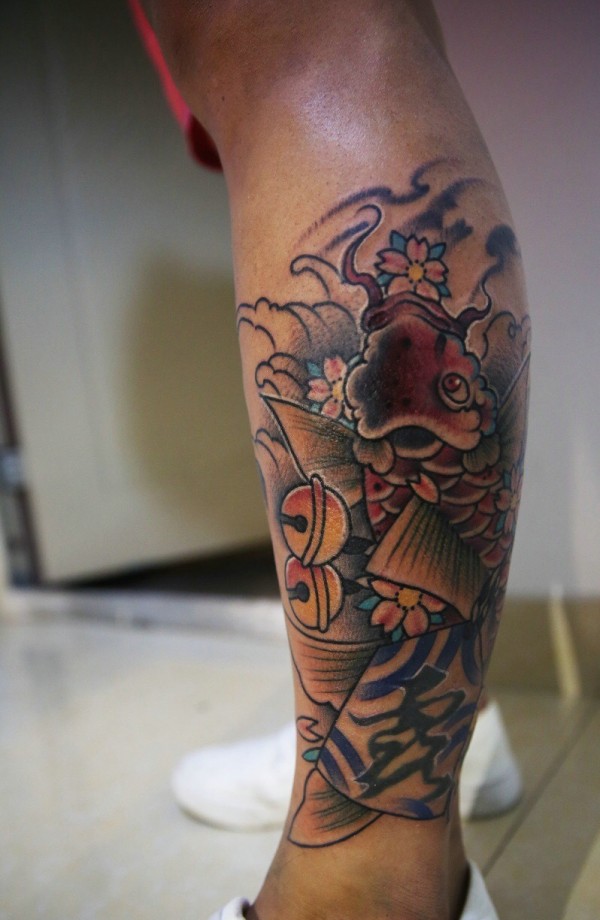 包小腿彩色红鲤鱼纹身刺青很抢眼