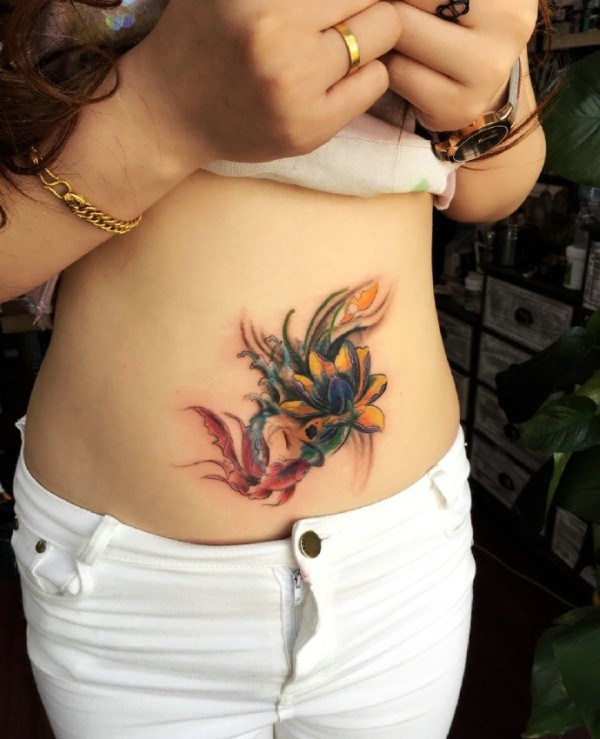 莲花遮盖蝎子的腹部纹身刺青