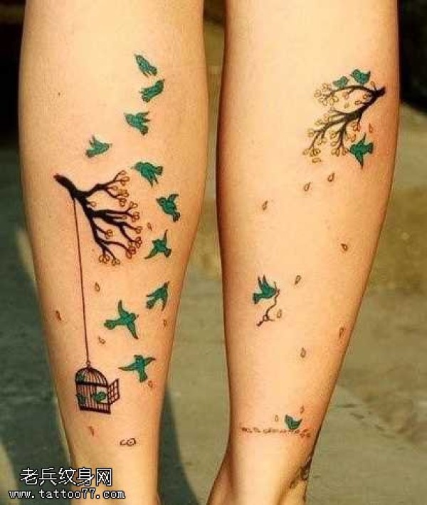 腿部图腾树小鸟纹身图案