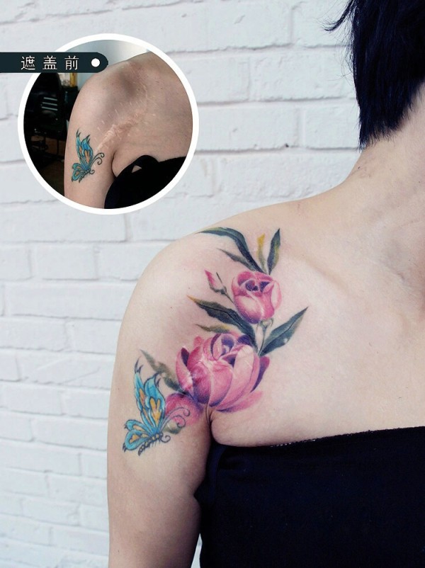完美掩盖肩膀疤痕花蝴蝶纹身
