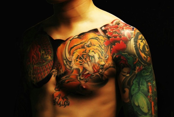 没有任何瑕疵的双半甲彩色老虎纹身图案