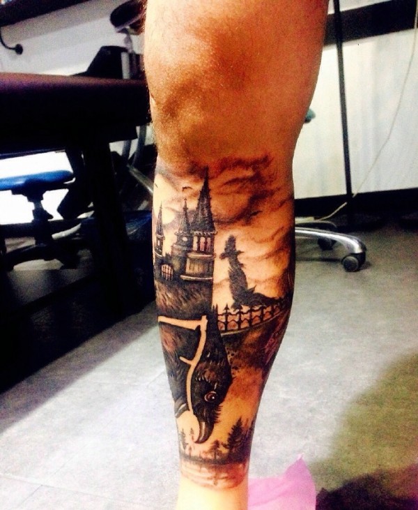 包小腿个性黑白城堡纹身图案