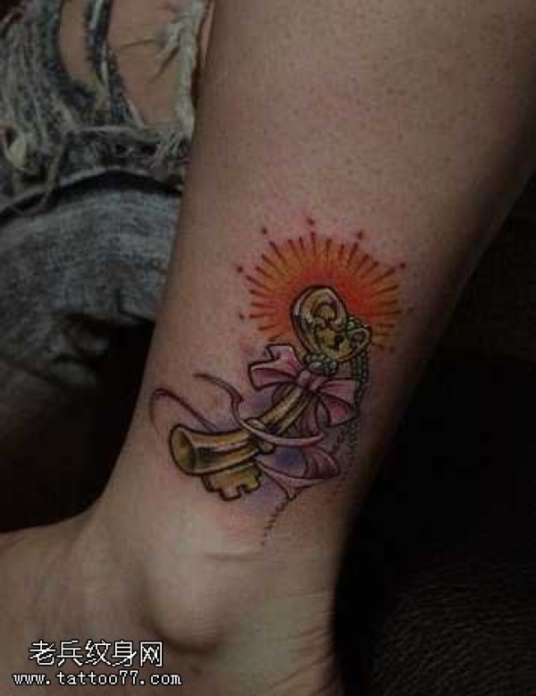 腿部好看的钥匙蝴蝶结纹身图案