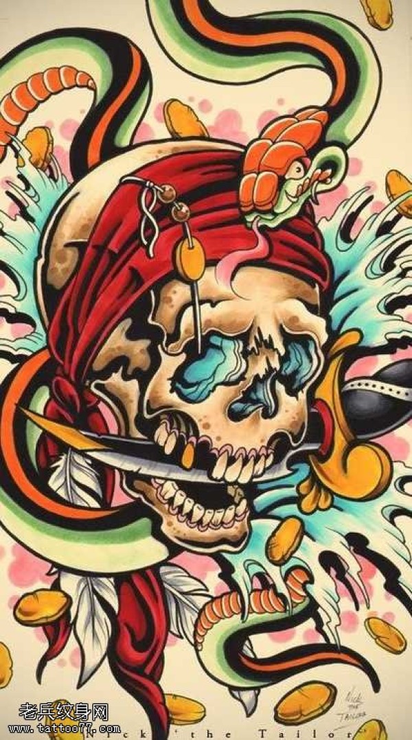 手稿骷髅和蛇的霸气组合纹身图案