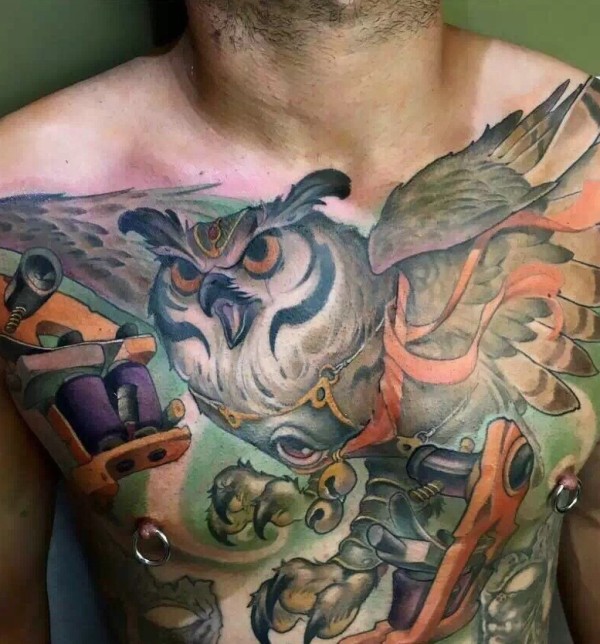 男士胸前彩色猫头鹰纹身刺青霸气十足