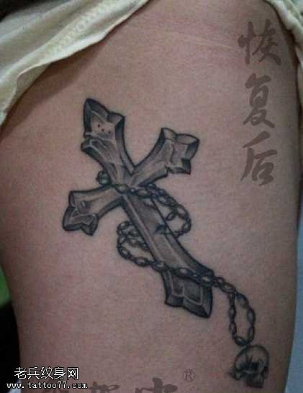 腿部潮流的十字架纹身图案