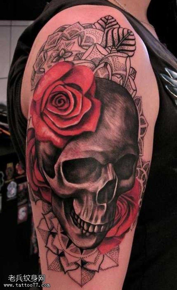 女生手臂经典潮流的骷髅与玫瑰花纹身图案