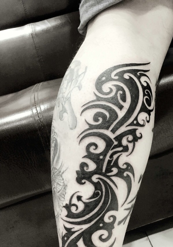 小腿个性经典的黑白图腾纹身刺青