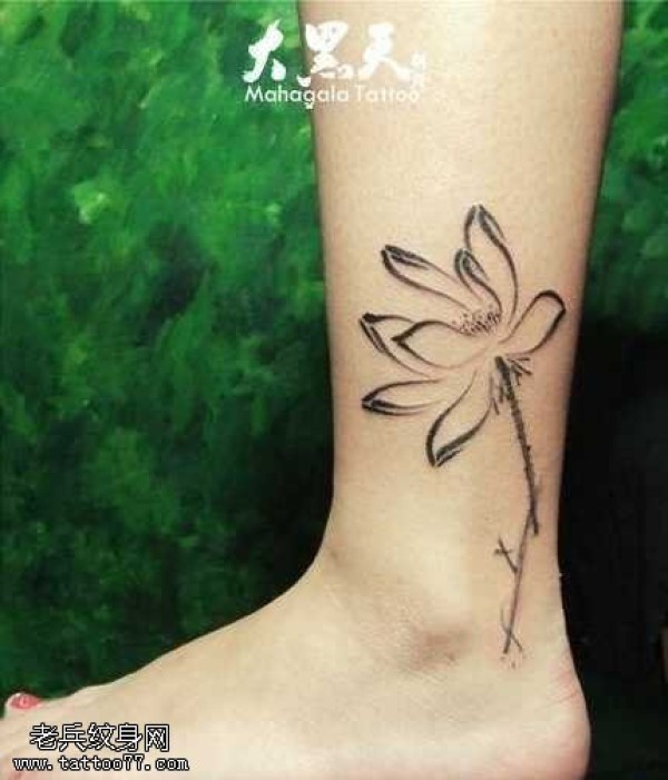 腿部水墨画莲花纹身图案