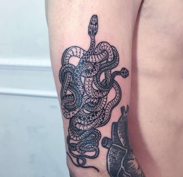 缠绕在一起的黑白色蛇纹身