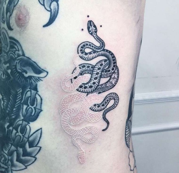缠绕在一起的黑白色蛇纹身