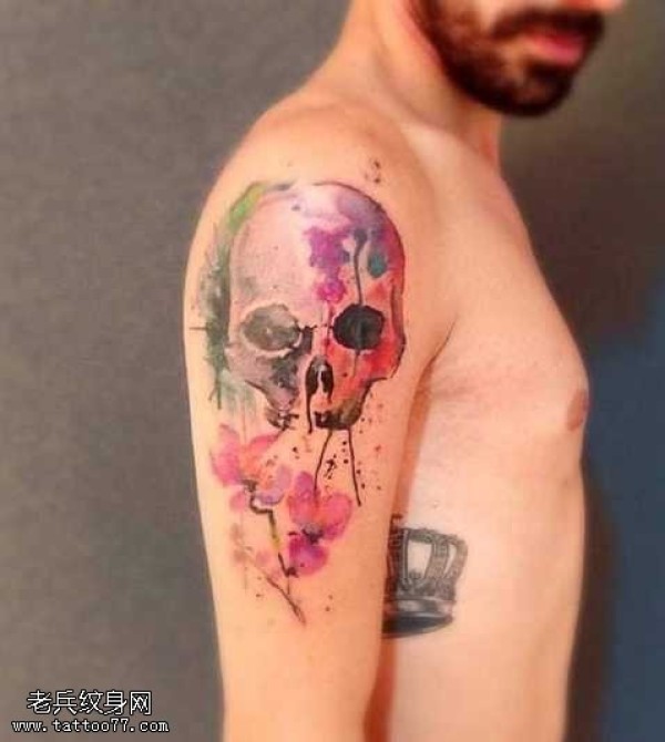 手臂彩色泼墨骷髅纹身图案