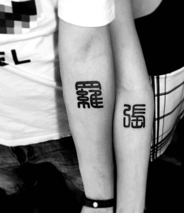 个性情侣手臂有着个性繁体汉字纹身刺青