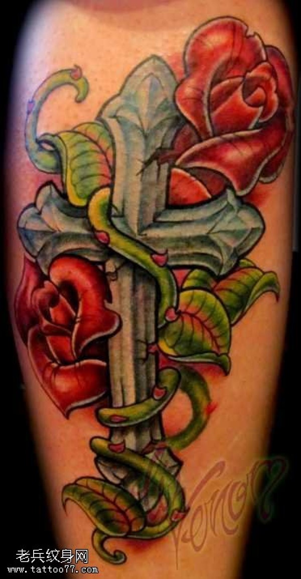 腿部十字架玫瑰纹身图案