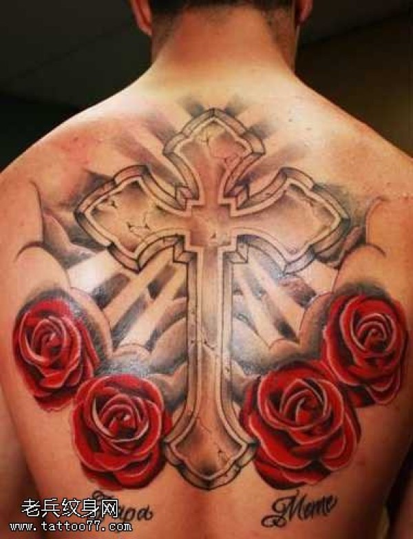 背部漂亮十字架玫瑰纹身图案